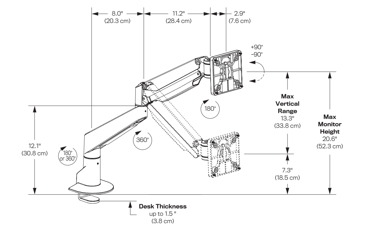 - Vertical Range: The E2 Articulating Monitor Arm offers a full 13.3" of vertical range which should accommodate the viewing needs of almost any worker. The bottom of a 23" diagonal monitor can be brought down to only about 1 - 1.5" off the mounting surface, while at maximum elevation the top of the same monitor would be almost 27" above the mounting point.