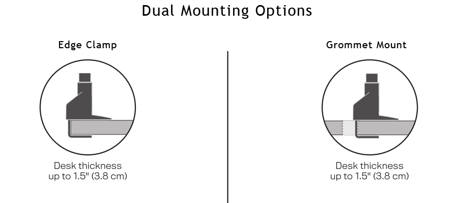 - Select the Optimal Mounting Location | Since the E2 Dual Monitor Arm comes with a 2-in-1 configurable top down mount, you have two options when it comes to mounting your monitor arm. Most people choose the desk clamping option but this only works if your desk has a lip on the mounting side and average depth (24-30"). Otherwise, a grommet mount is the next best option. You need a grommet hole of at least 2.25" diameter for the grommet mount to work, whereas the through mount requires that you drill a small hole in the desk to bolt the mount through the desk to secure it. You may want to roughly position the mount in different locations at first to get an idea of where the movement of the arm is optimal and then decide on which mounting option works best at that location.