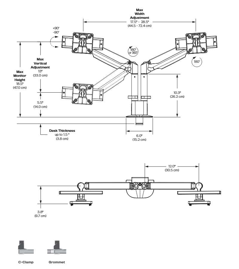 - Width Adjustment Range: The E2 Dual Monitor Arm provides 17.5" to 28.5" of horizontal width adjustment, allowing monitors of various sizes to be brought closer or further apart in the same visual plane.