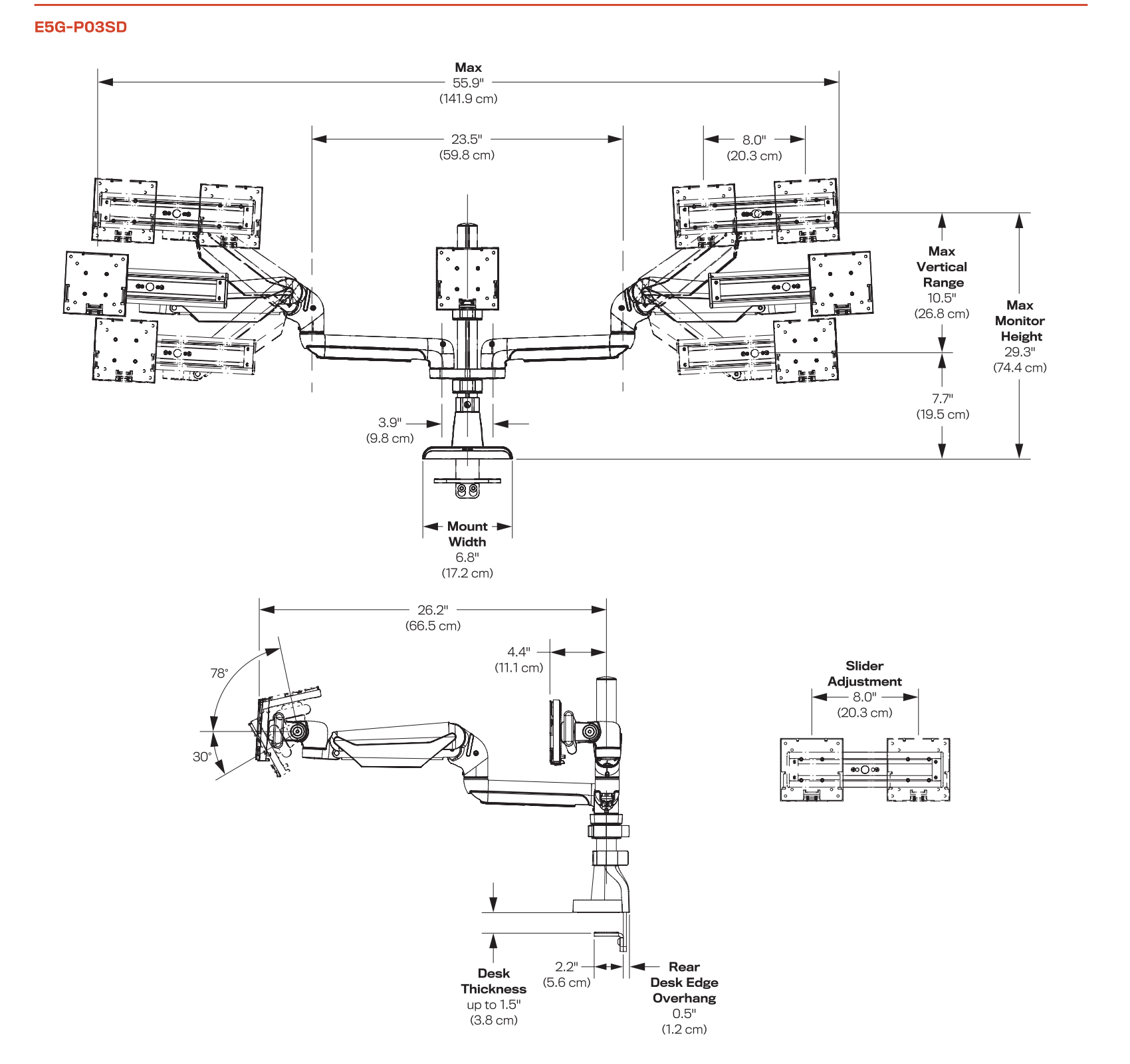 - Vertical Range: The E5 Triple Dynamic Pole Monitor Arm offers a full 10.5" of vertical range which should accommodate the viewing needs of most workers. The bottom of a 23" diagonal monitor can be brought down to only about 1 - 1.5" off the mounting surface, while at maximum elevation the top of the same monitor would be about 24" above the mounting point.