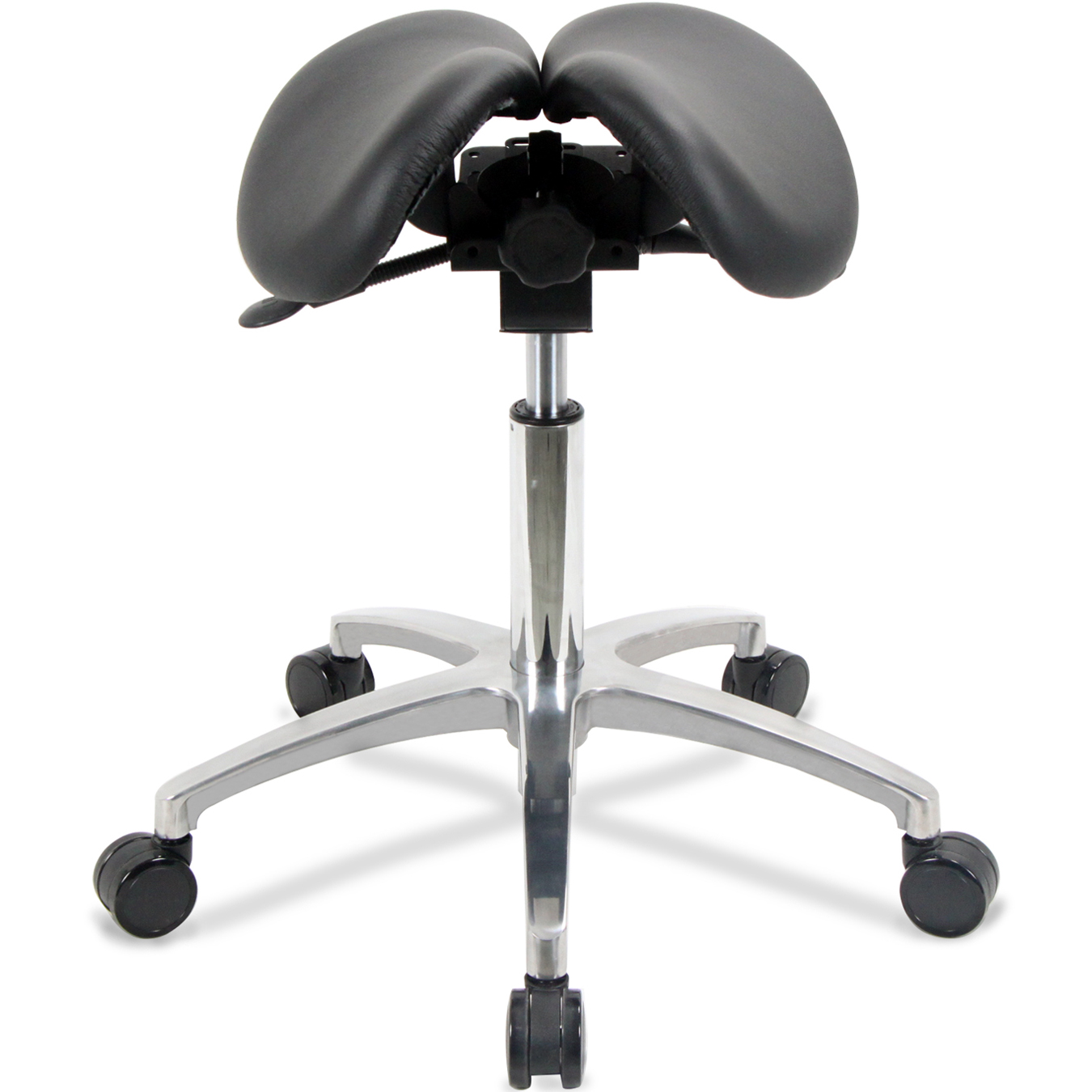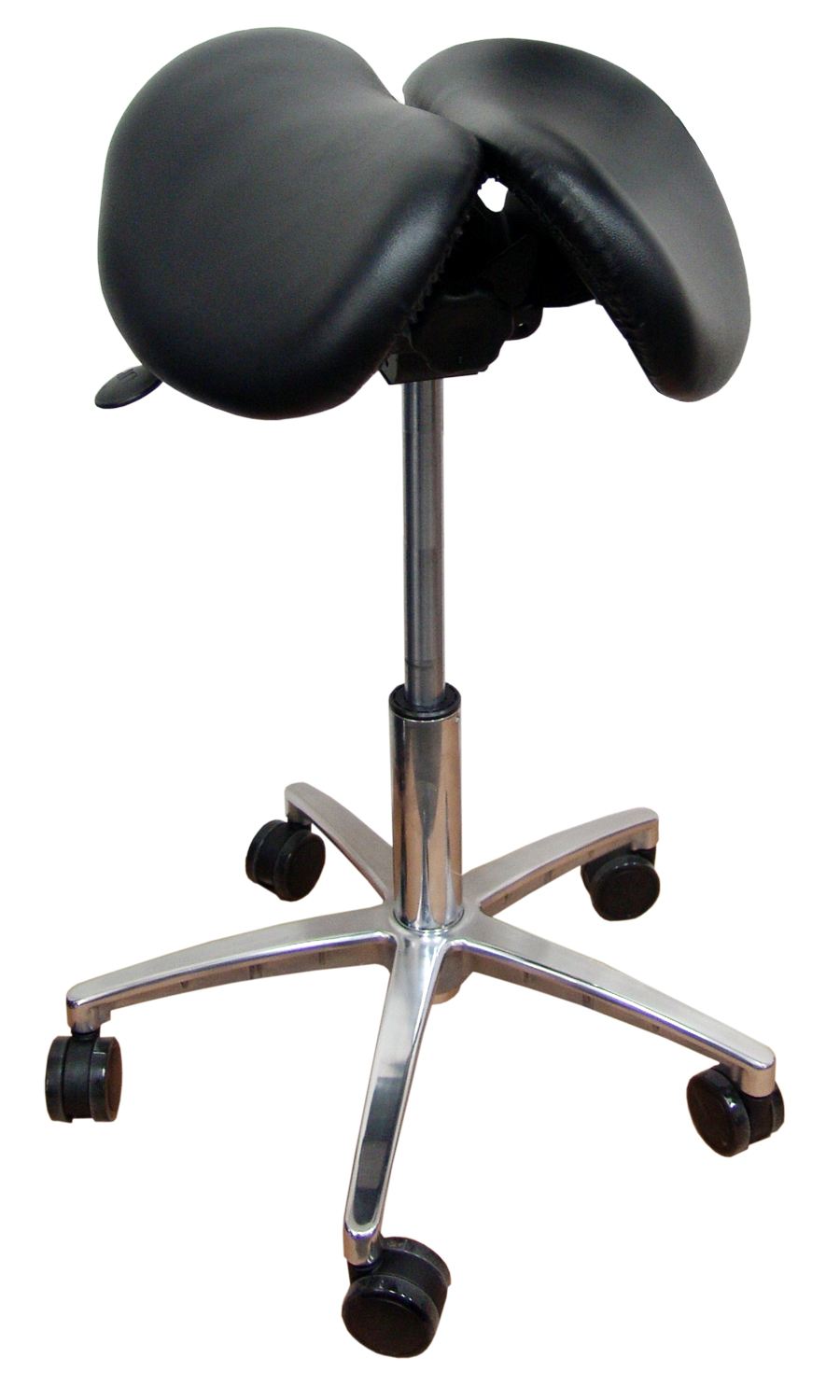 - Split Saddle Design: Split Saddle stools are designed to provide support in the right places. Weight is spread across and borne primarily by the sitting bones. A saddle seat at the correct height will also generally transfer some weight onto the insides of the thighs which further aids in spreading the weight over a larger surface area. By removing the crown of the saddle the risk of concentrating weight over a small and sensitive zone is eliminated while the split design also encourages natural convective cooling airflow, resulting is a more enjoyable sitting experience than that offered by traditional chairs or one-piece saddle seats.