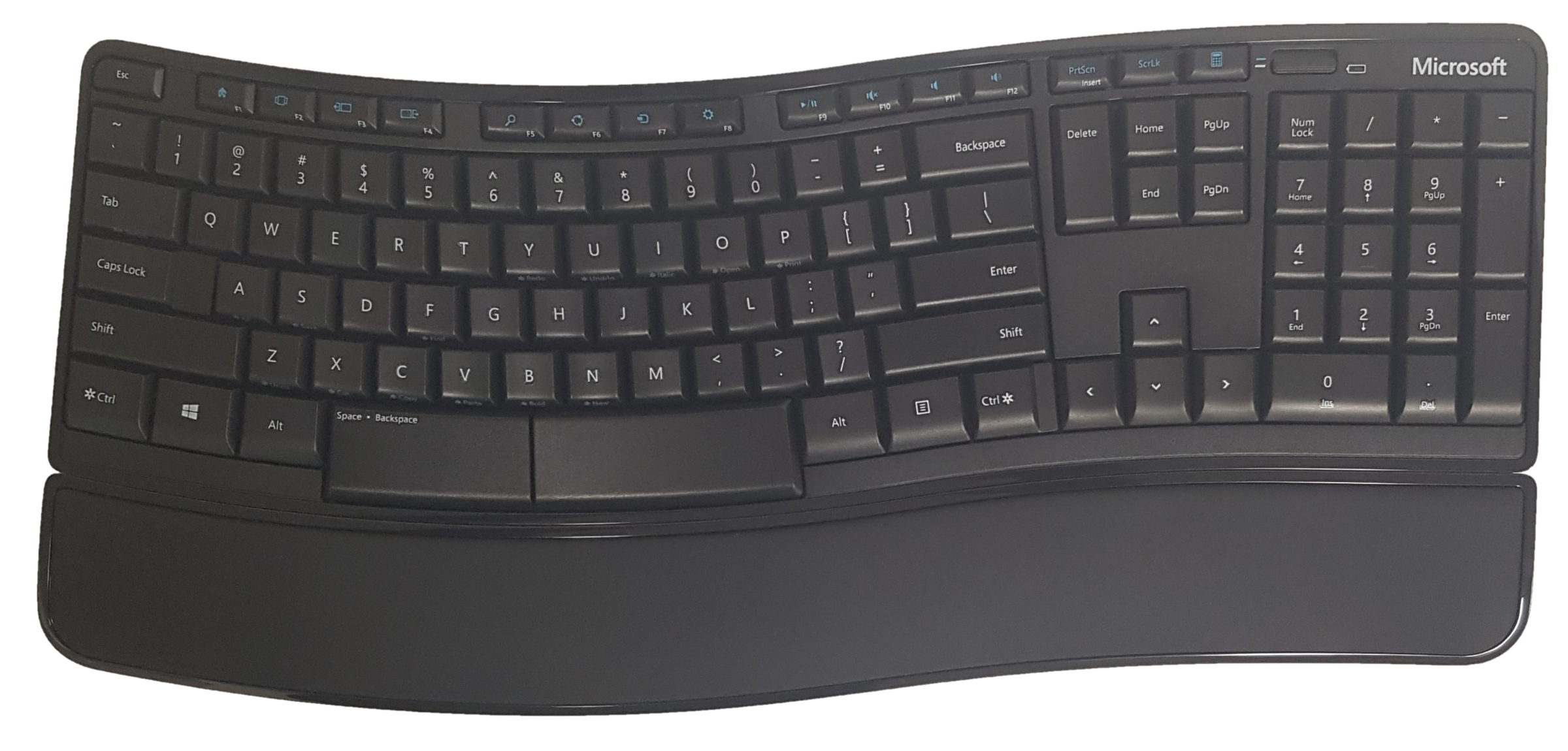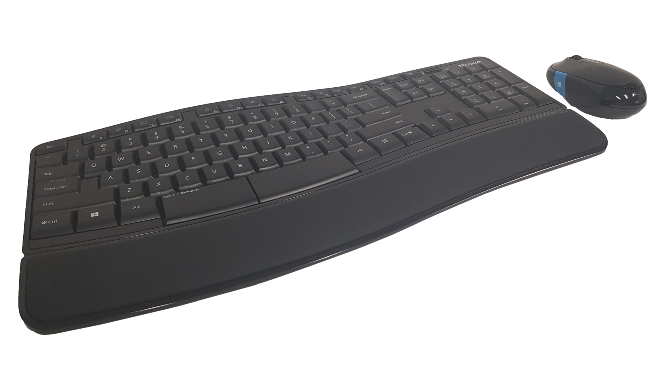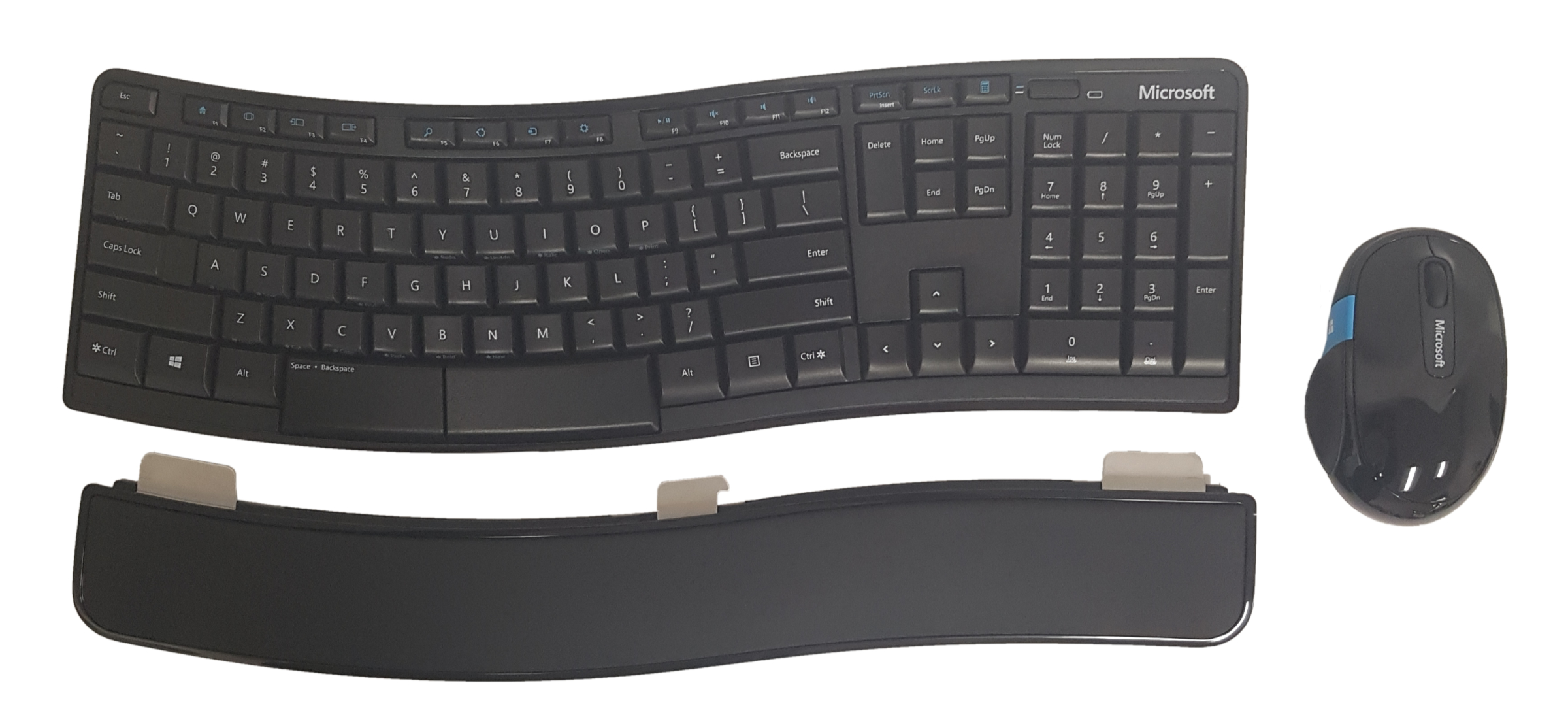 The Sculpt Comfort Desktop from Microsoft is a wireless (2.4 GHz) keyboard and mouse combination. The keyboard features a subtle gull-wing design that orients keys at varying angles, rising slightly at the middle and transitioning to a traditional "flat" or 0° by the time the outer alpha keys are reached. The keys are also angled slightly outward at the middle, transitioning to straight at the outer alpha/numeric keys. The navigation and numeric keypad keys are standard straight alignment and level. The split spacebar features extra-deep keys. The keyboard is equipped with a detachable padded leather-like palm support to aid in reducing wrist extension.